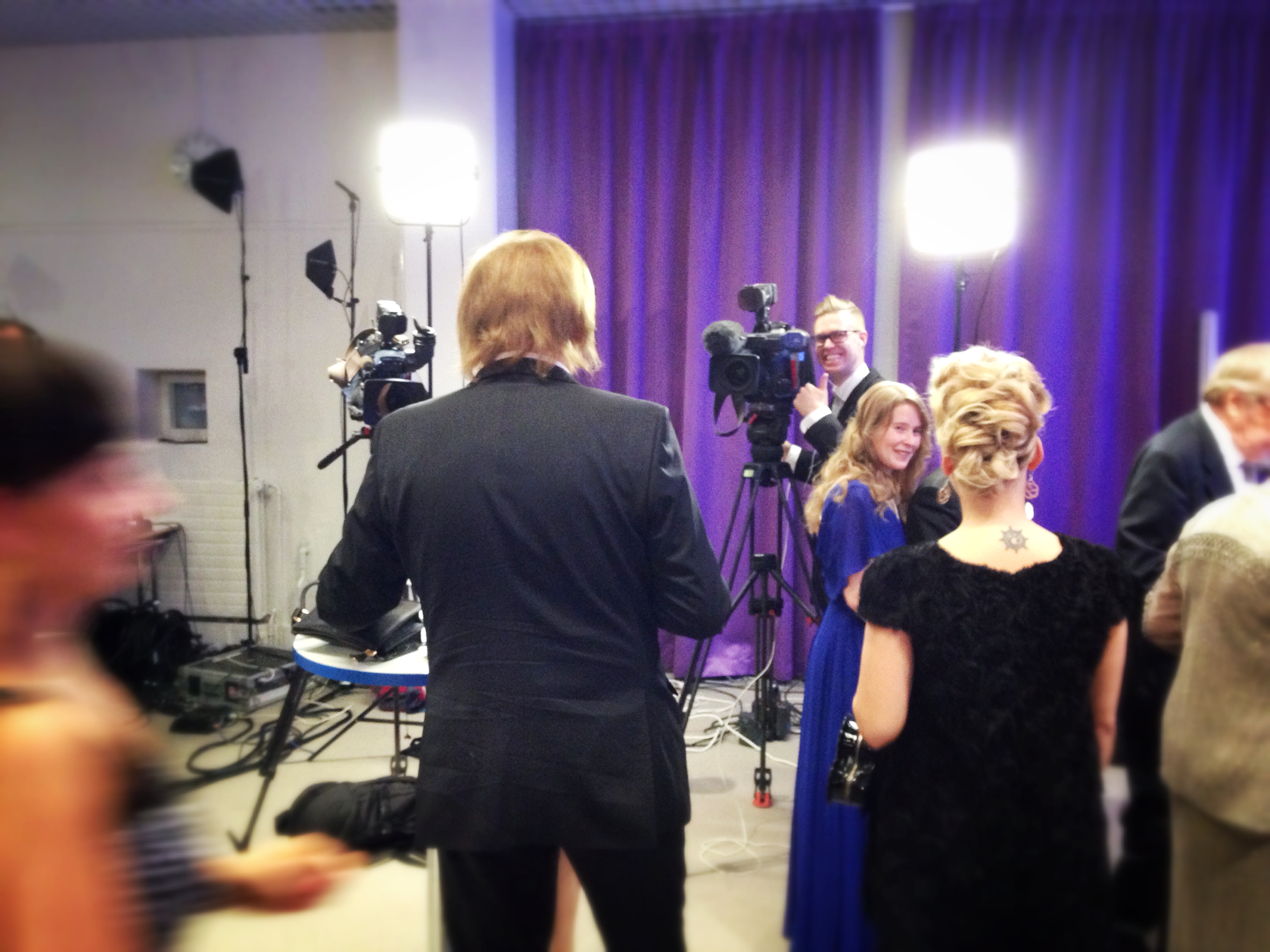 Illan jälkimmäinen osa kuvattiin talon toisessa päädyssä. Päädyimme rinnakkaisiin kamerapaikkoihin, koska tällöin pystyimme tekemään kevyttä monikameraa tilanteiden johtaessa siihen. Kun MTV3 ja Yle olivat samalla seinustalla meidän kanssa niin se takasi aika hyvin työrauhan eli juhlavieraat eivät tulleet metriä lähemmäksi kameraa – ainakaan niin usein kuin alkuillasta.