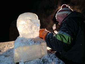 Kävimme tapaamassa jääveistäjää Timo Koivistoa Porvoossa. Ilta ehti jo pimetä ja itsellä ei tietenkään ollut salamaa stillikameraan mukana. Päästiin perille ja Timo johdatti meidät kuusimetsän reunustamalle pimeälle takapihalleen. Hetken jo nauratti tilanne. Onneksi häneltä löytyi perus työmaavalo vintiltä, joka laitettin 5 metrin päähän jääkimpaleesta. Käytin sitä takavalona sekä videota että valokuvia ottaessani. Jalustalla olleen videokameran akkuvalosta sain toisen valonlähteen aikaan, joten yhtäkkiä pimeälle takapihalle saatiin aikaan 2-piste valot.