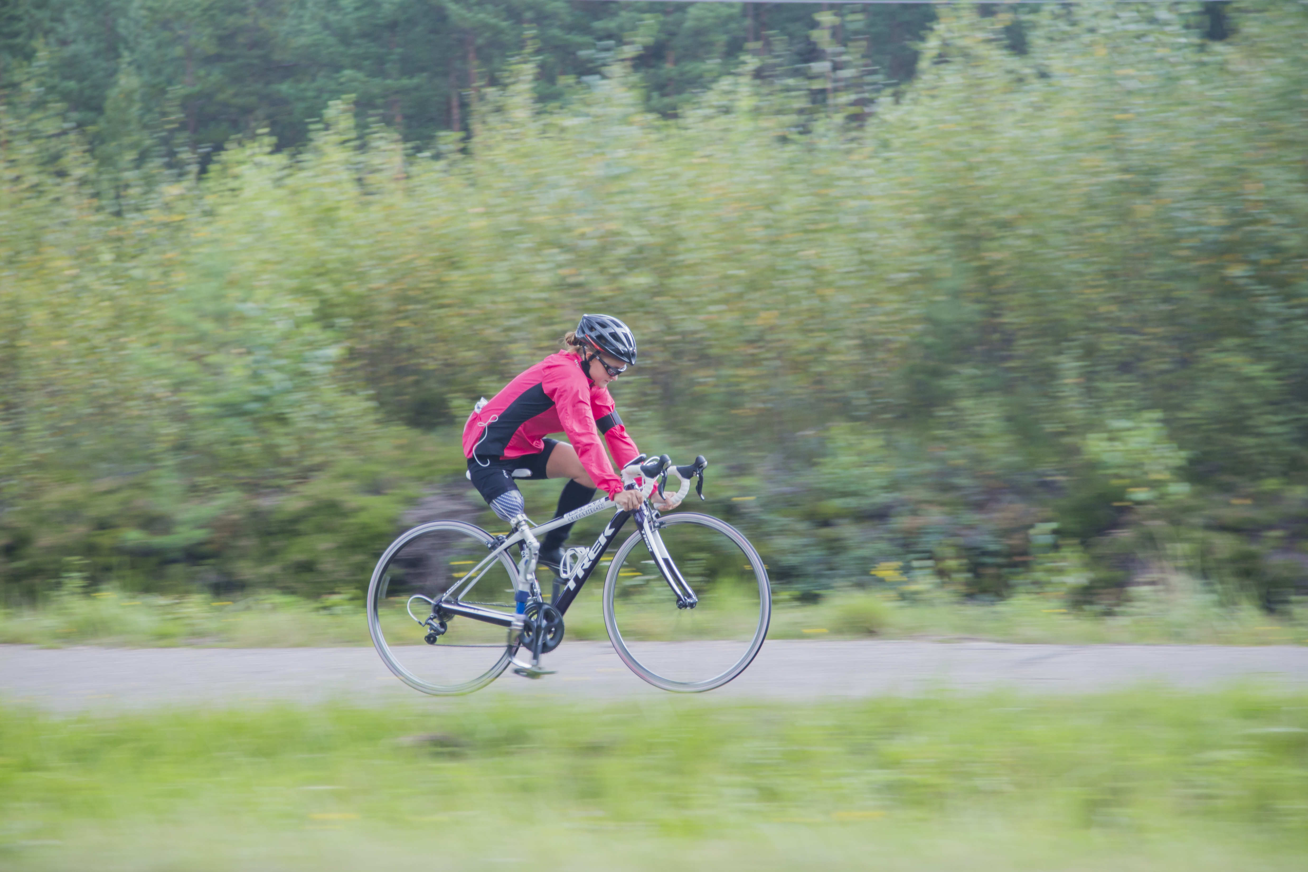 Seuraavaksi ajoimme Kuusijärven ulkoilupaikalle. Siellä Liisa vaihtoi pyöräilytamineet päälle ja lähti vetämään pyöräilyharjoitustaan läpi. Tarkoitukseni oli ajaa autolla hänen vierellään ja kuvata auton kylkeen kiinnitetyllä GoPro kameralla pyöräilyä. Se olikin mahdotonta, koska liikenne oli liian suuri kyseisellä tienpätkällä. Turvallisuuden takia päädyimme siihen, että Liisa ajoi pyörätietä ja minä kuvasin autosta ojan ja pientareen takaa liikkuvasta autosta. Käyttämäni peruslinssi, Canon 24-105 mm F4 IS USM lisättynä Lightcraftin ND Fader MII -suotimella, toimi hyvin kuvauksiin toimittajan ajaessa autoa.