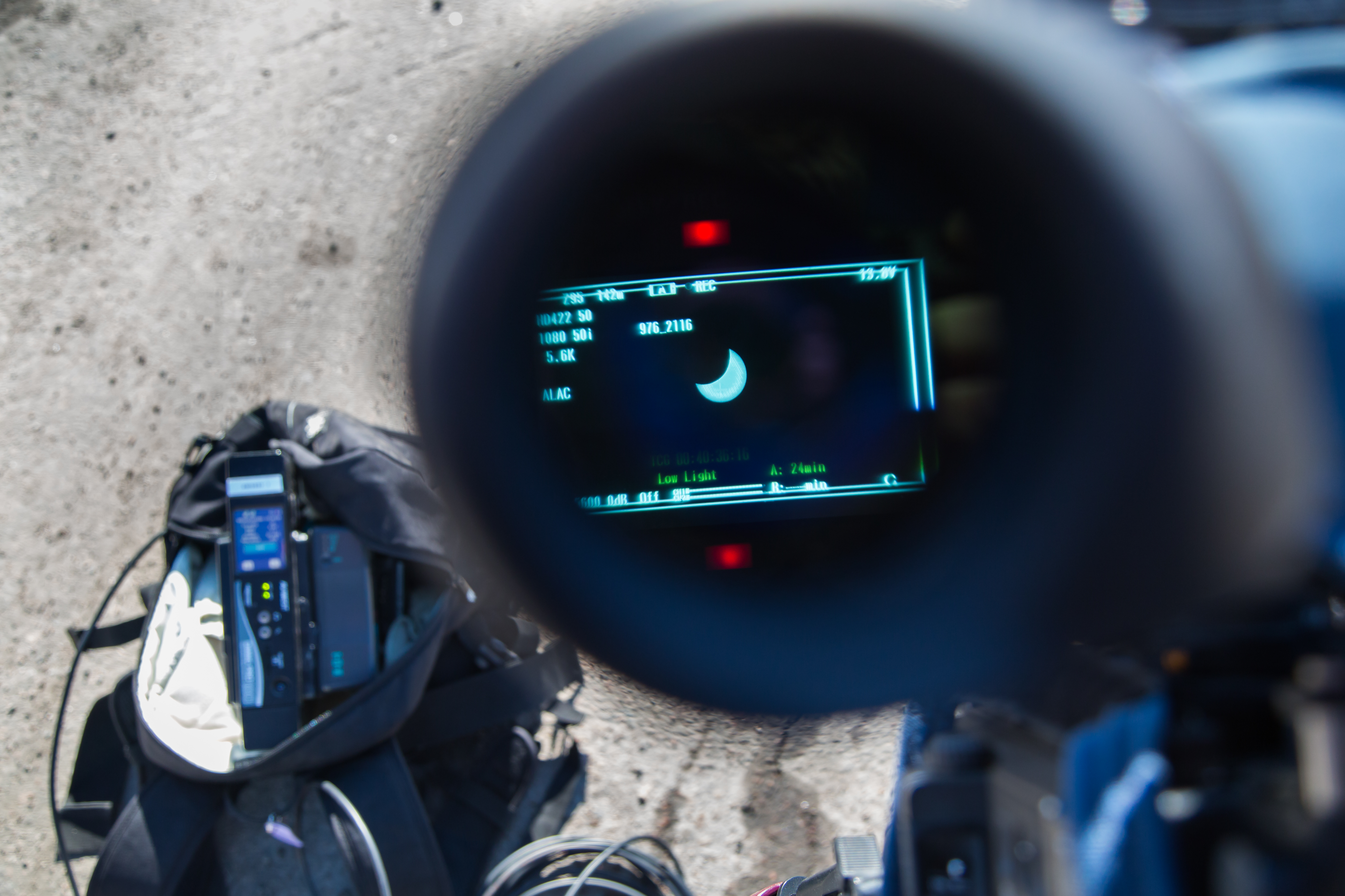Päätimme kuvatuottaja Matti Nousiaisen kanssa kasata pikaisesti kaksi kameraa sekä yhden Aviwest live -lähettimen minulle mukaan. Matti oli jo teipannut molempien linssien eteen kolminkertaiset ND16 kalvot. Tummentavat filtterit mahdollistavat kirkkaan kohteen kuvaamisen. Vaikka etäisyys maasta aurinkoon on 150 000 000 km niin silti valon määrä on aivan tolkuton suoraan kohti aurinkoon kuvatessa.