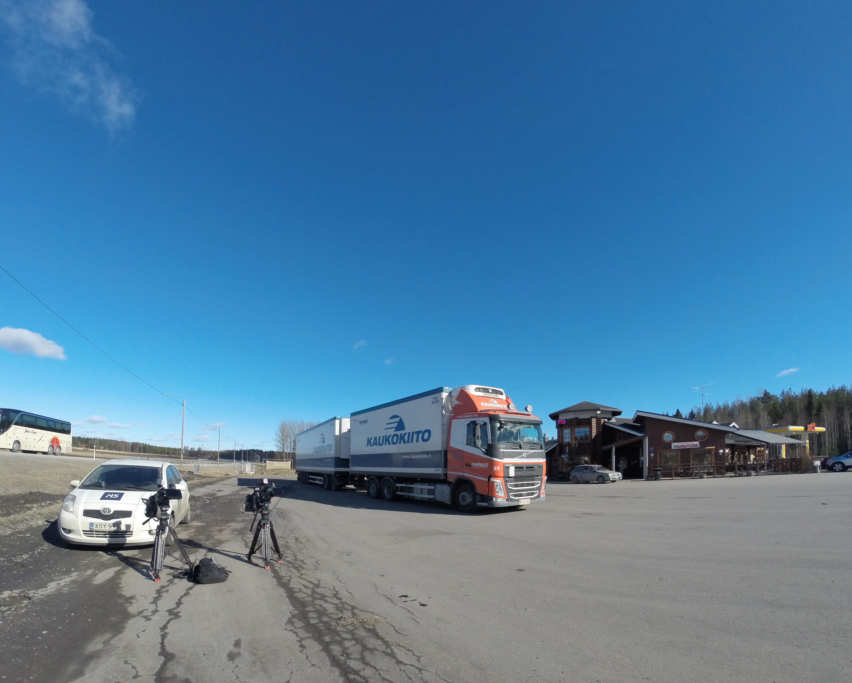 Pilviverho loppui Heinolan jälkeen. Ajoin Nelostietä Hartolaan saakka ja pystytin kamerat paikalleen ST1 Taukotupa bensa-aseman pihaan. Pimennys oli juuri alkanut. Timelapse -kameraan otin laajan kuvan ja laitoin jalustan lukot kiinni. Kameran asemointia muuttaen annoin auringon siirtyä kolmesti koko kuva-alan läpi. Näin sain kolme tasaliikkeistä videoklippiä. Kuvanottoaika käytin 1 kuva per 5 sekuntia.