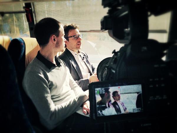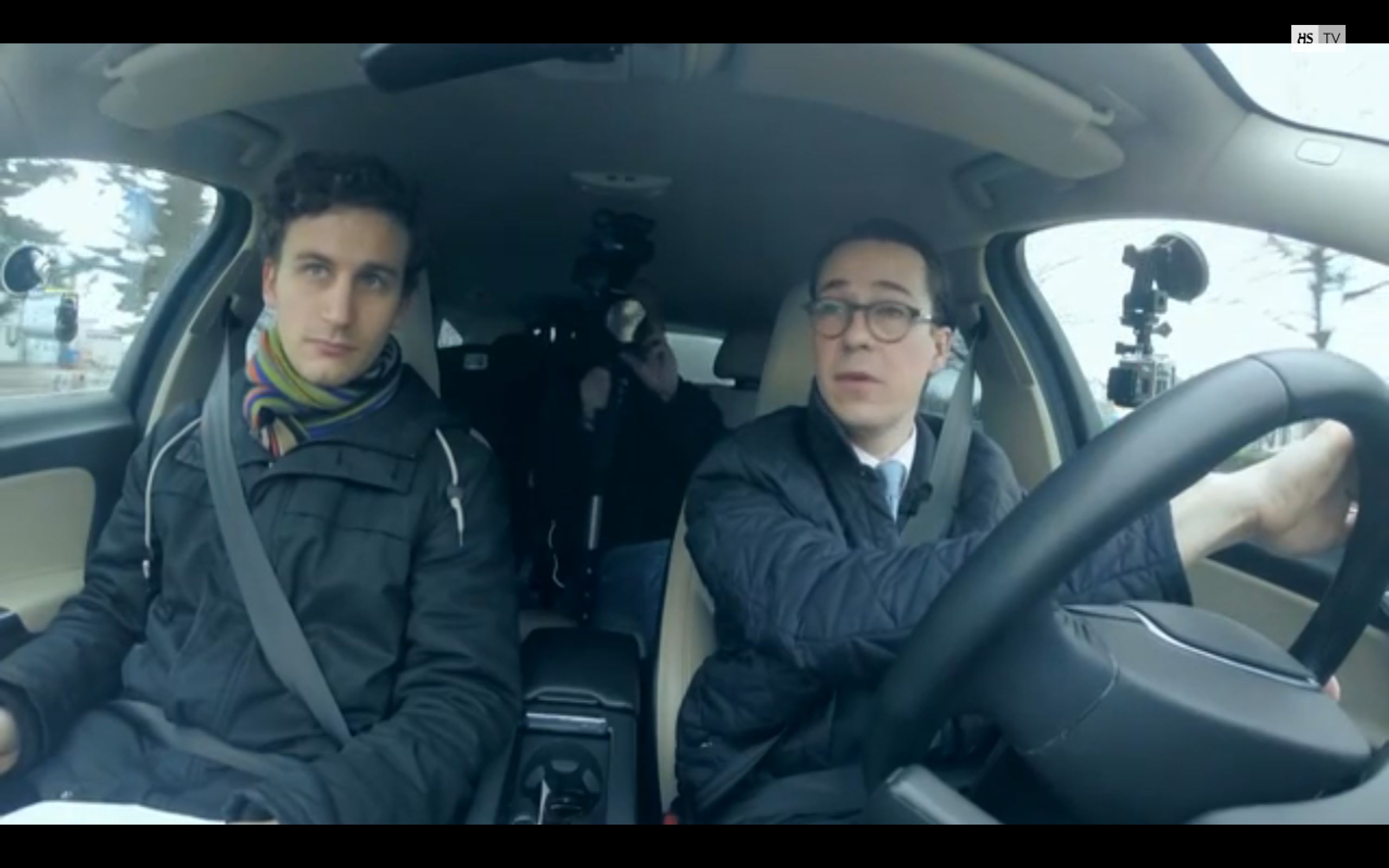 Kuva kojelaudassa olevasta Sonyn Action kamerasta. Toimittaja Jussi Sippola vasemmalla jututtaa ajavaa Carl Haglundia. Vasemmassa ikkunassa Sonyn Action kamera imukuppikiinnityksellä, keskellä minulla C100 monopodilla ja oikealla ikkunassa GoPro.